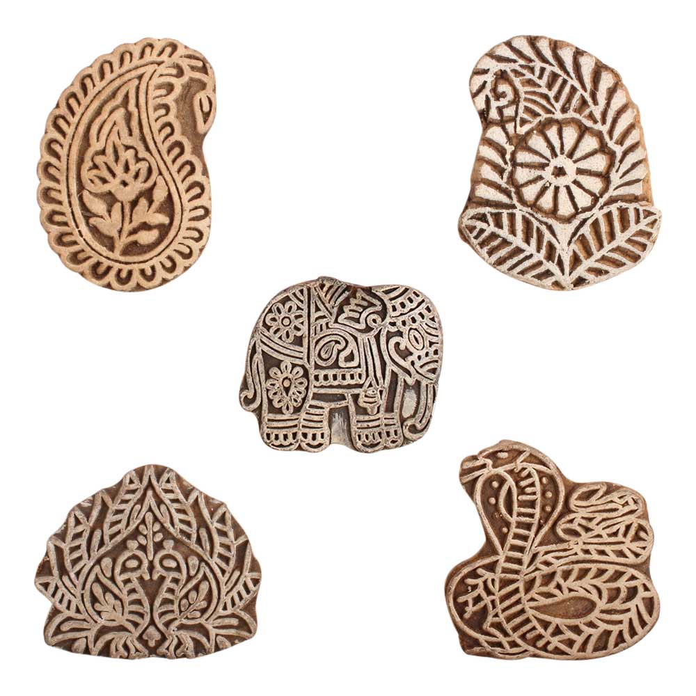 Set of 5 Piece New Mix Wooden Printing Block. Ideal for use on Fabric, Paper, Canvas, etc. These Blocks can be use to Print with Oil Colors, Fabric Colors, Water Colors, Acrylic Colors and Vegetable Colors.
