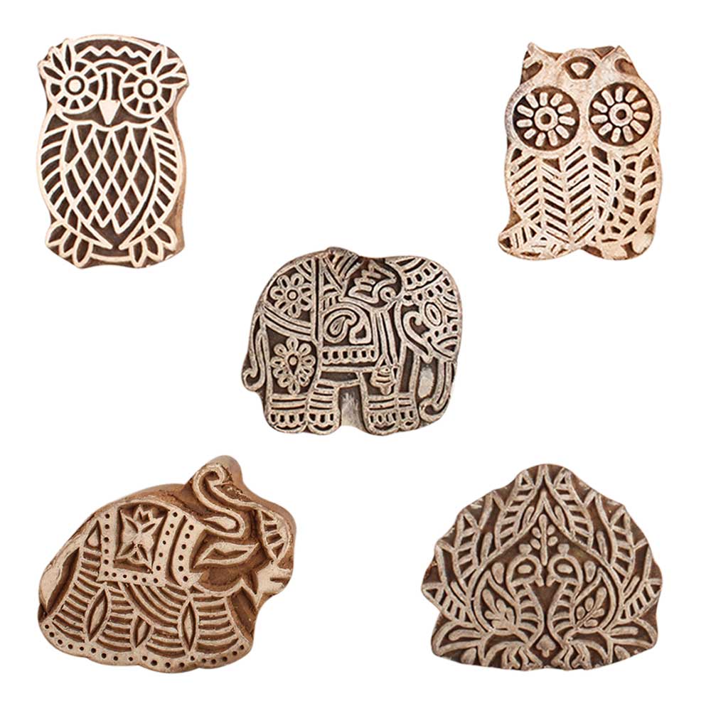 Set of 5 Piece New Mix Wooden Printing Block. Ideal for use on Fabric, Paper, Canvas, etc. These Blocks can be use to Print with Oil Colors, Fabric Colors, Water Colors, Acrylic Colors and Vegetable Colors.