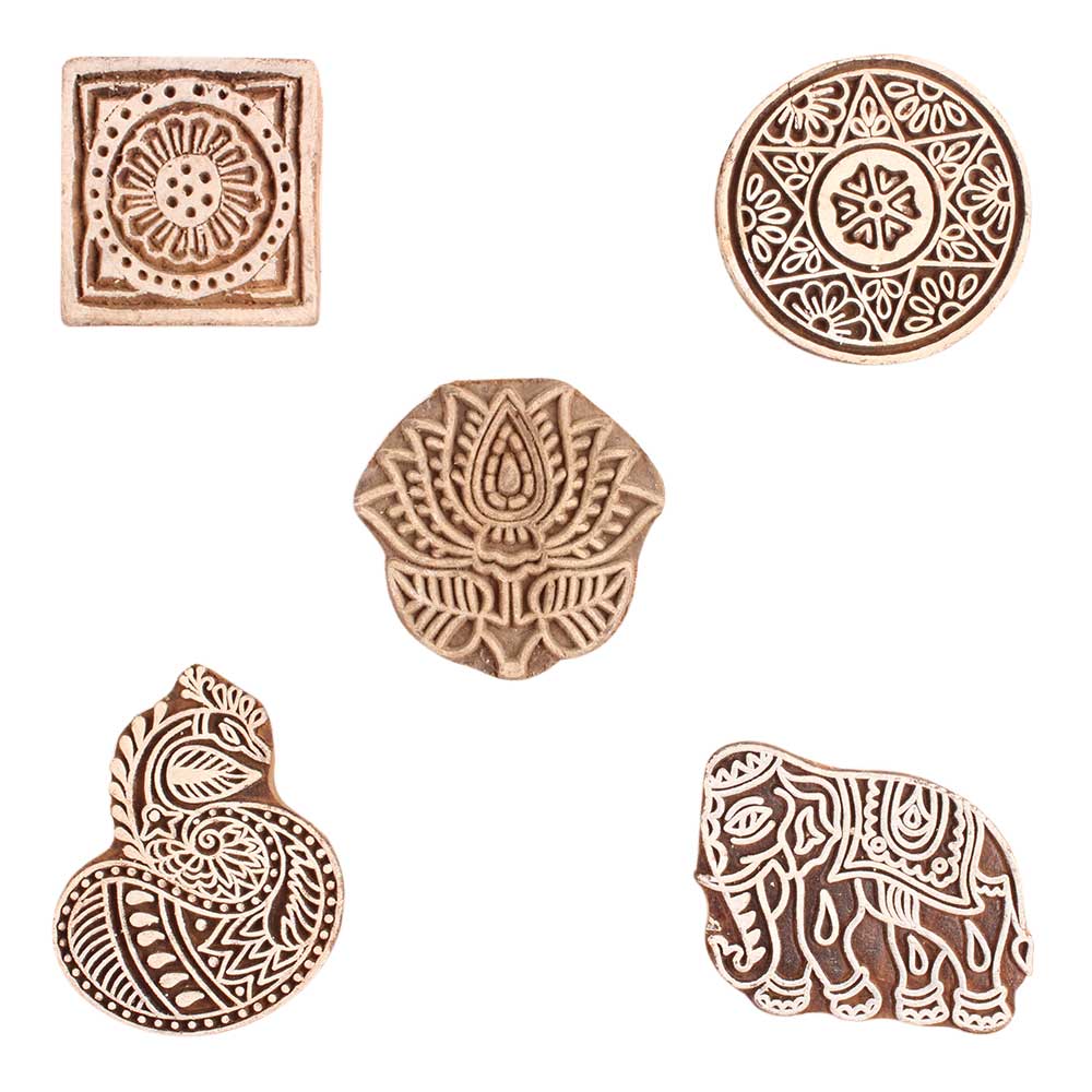 Set of 5 Piece New Mix Wooden Printing Block. Ideal for use on Fabric, Paper, Canvas, etc. These Blocks can be use to Print with Oil Colors, Fabric Colors, Water Colors, Acrylic Colors and Vegetable Colors.