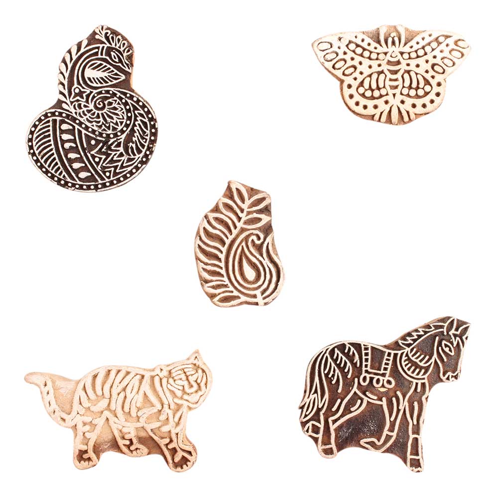 Set of 5 Piece New Mix Wooden Printing Block. Ideal for use on Fabric, Paper, Canvas, etc. These Blocks can be use to Print with Oil Colors, Fabric Colors, Water Colors, Acrylic Colors and Vegetable Colors.