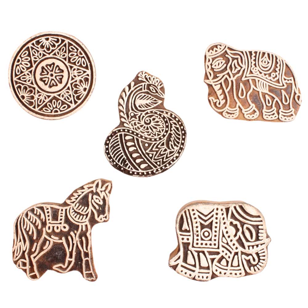 Set of 5 Piece New Mix Wooden Printing Block. Ideal for use on Fabric, Paper, Canvas, etc. These Blocks can be use to Print with Oil Colors, Fabric Colors, Water Colors, Acrylic Colors and Vegetable Colors.