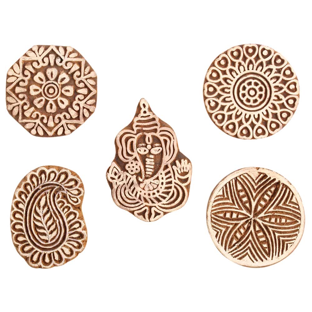 Set of 5 Piece New Mix Wooden Printing Block. Ideal for use on Fabric, Paper, Canvas, etc. These Blocks can be use to Print with Oil Colors, Fabric Colors, Water Colors, Acrylic Colors and Vegetable Colors.