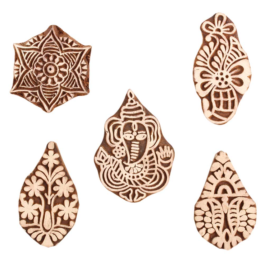Set of 5 Piece New Mix Wooden Printing Block. Ideal for use on Fabric, Paper, Canvas, etc. These Blocks can be use to Print with Oil Colors, Fabric Colors, Water Colors, Acrylic Colors and Vegetable Colors.