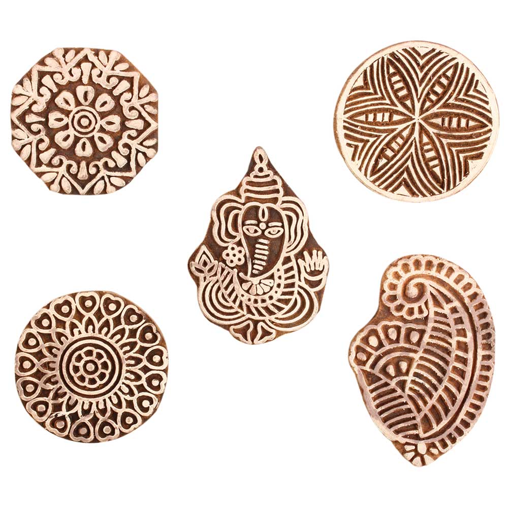 Set of 5 Piece New Mix Wooden Printing Block. Ideal for use on Fabric, Paper, Canvas, etc. These Blocks can be use to Print with Oil Colors, Fabric Colors, Water Colors, Acrylic Colors and Vegetable Colors.