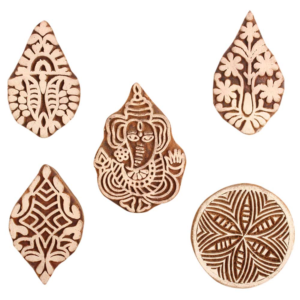 Set of 5 Piece New Mix Wooden Printing Block. Ideal for use on Fabric, Paper, Canvas, etc. These Blocks can be use to Print with Oil Colors, Fabric Colors, Water Colors, Acrylic Colors and Vegetable Colors.