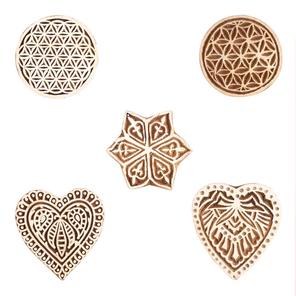 Set of 5 Piece New Mix Wooden Printing Block. Ideal for use on Fabric, Paper, Canvas, etc. These Blocks can be use to Print with Oil Colors, Fabric Colors, Water Colors, Acrylic Colors and Vegetable Colors.
