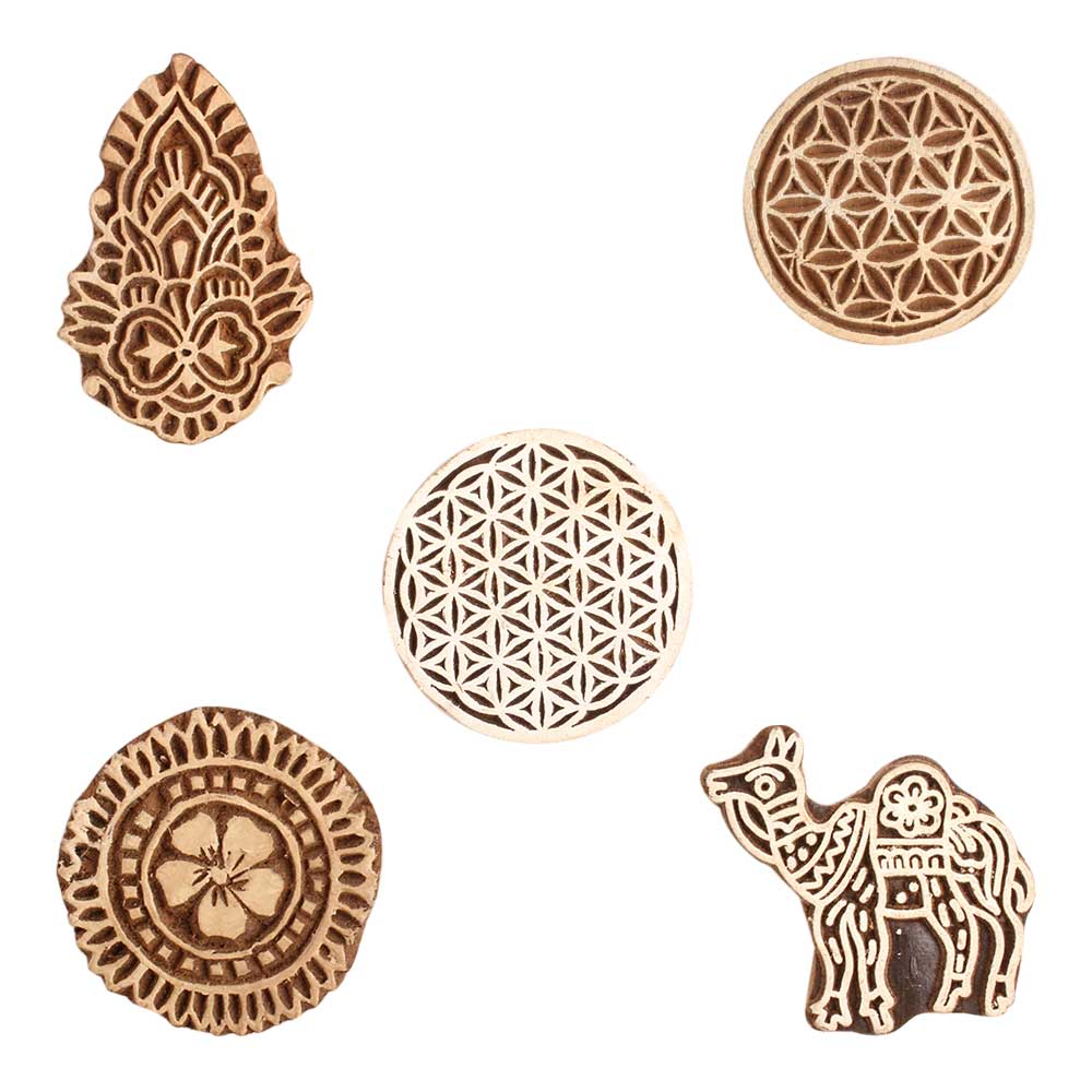 Set of 5 Piece New Mix Wooden Printing Block. Ideal for use on Fabric, Paper, Canvas, etc. These Blocks can be use to Print with Oil Colors, Fabric Colors, Water Colors, Acrylic Colors and Vegetable Colors.
