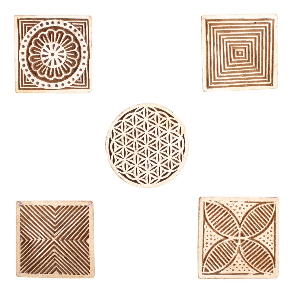 Set of 5 Piece New Mix Wooden Printing Block. Ideal for use on Fabric, Paper, Canvas, etc. These Blocks can be use to Print with Oil Colors, Fabric Colors, Water Colors, Acrylic Colors and Vegetable Colors.