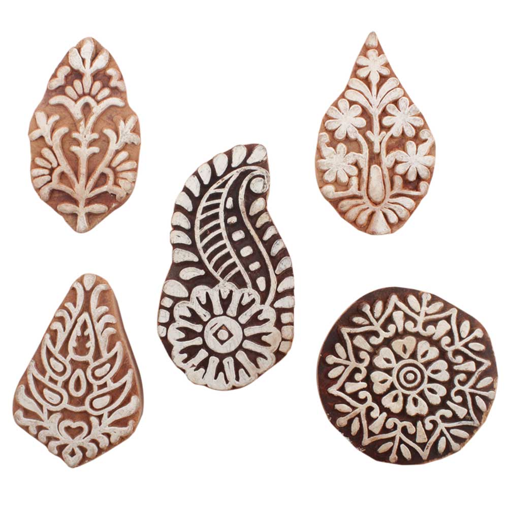 Set of 5 Piece New Mix Wooden Printing Blocks. Ideal for use on Fabric, Paper, Canvas, etc. These Blocks can be use to Print with Oil Colors, Fabric Colors, Water Colors, Acrylic Colors and Vegetable Colors.