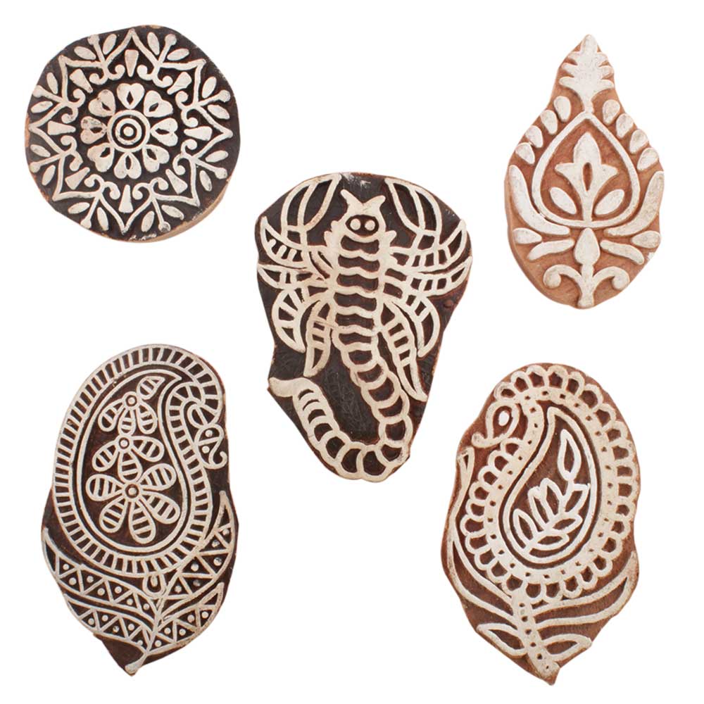 Set of 5 Piece New Mix Wooden Printing Blocks. Ideal for use on Fabric, Paper, Canvas, etc. These Blocks can be use to Print with Oil Colors, Fabric Colors, Water Colors, Acrylic Colors and Vegetable Colors.