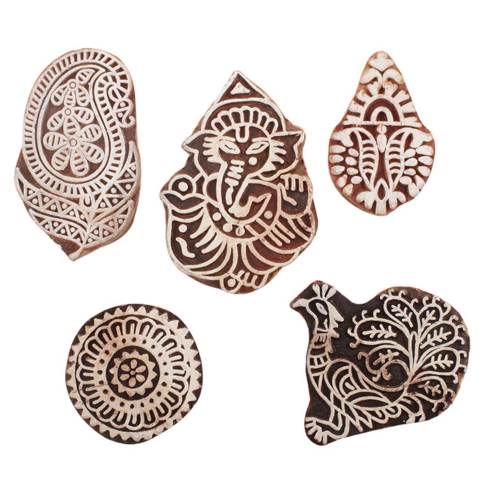 Set of 5 Piece New Mix Wooden Printing Blocks. Ideal for use on Fabric, Paper, Canvas, etc. These Blocks can be use to Print with Oil Colors, Fabric Colors, Water Colors, Acrylic Colors and Vegetable Colors.