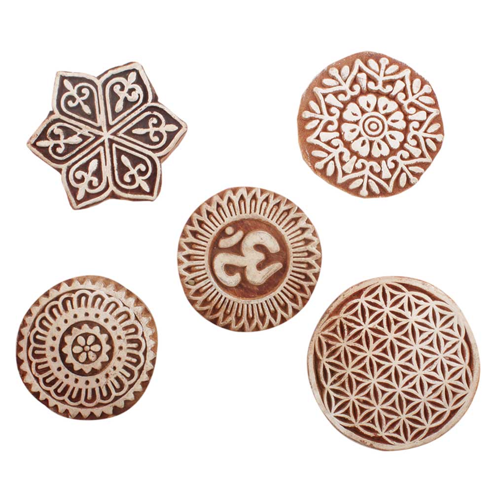 Set of 5 Piece New Mix Wooden Printing Blocks. Ideal for use on Fabric, Paper, Canvas, etc. These Blocks can be use to Print with Oil Colors, Fabric Colors, Water Colors, Acrylic Colors and Vegetable Colors.