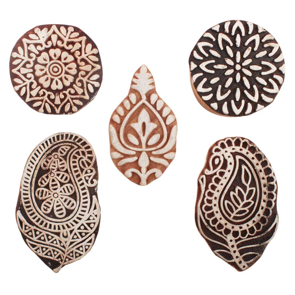 Set of 5 Piece New Mix Wooden Printing Blocks. Ideal for use on Fabric, Paper, Canvas, etc. These Blocks can be use to Print with Oil Colors, Fabric Colors, Water Colors, Acrylic Colors and Vegetable Colors.