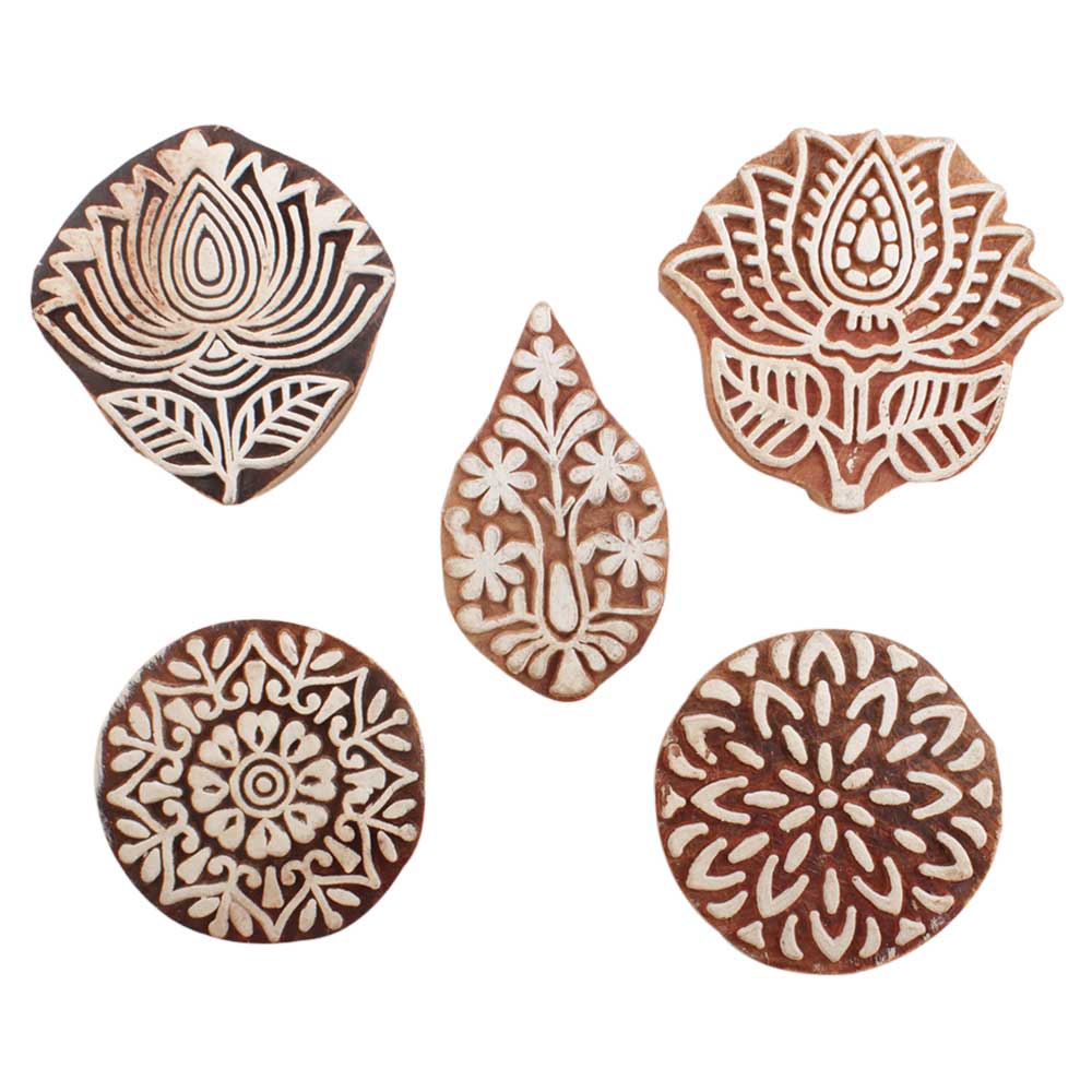 Set of 5 Piece New Mix Wooden Printing Blocks. Ideal for use on Fabric, Paper, Canvas, etc. These Blocks can be use to Print with Oil Colors, Fabric Colors, Water Colors, Acrylic Colors and Vegetable Colors.