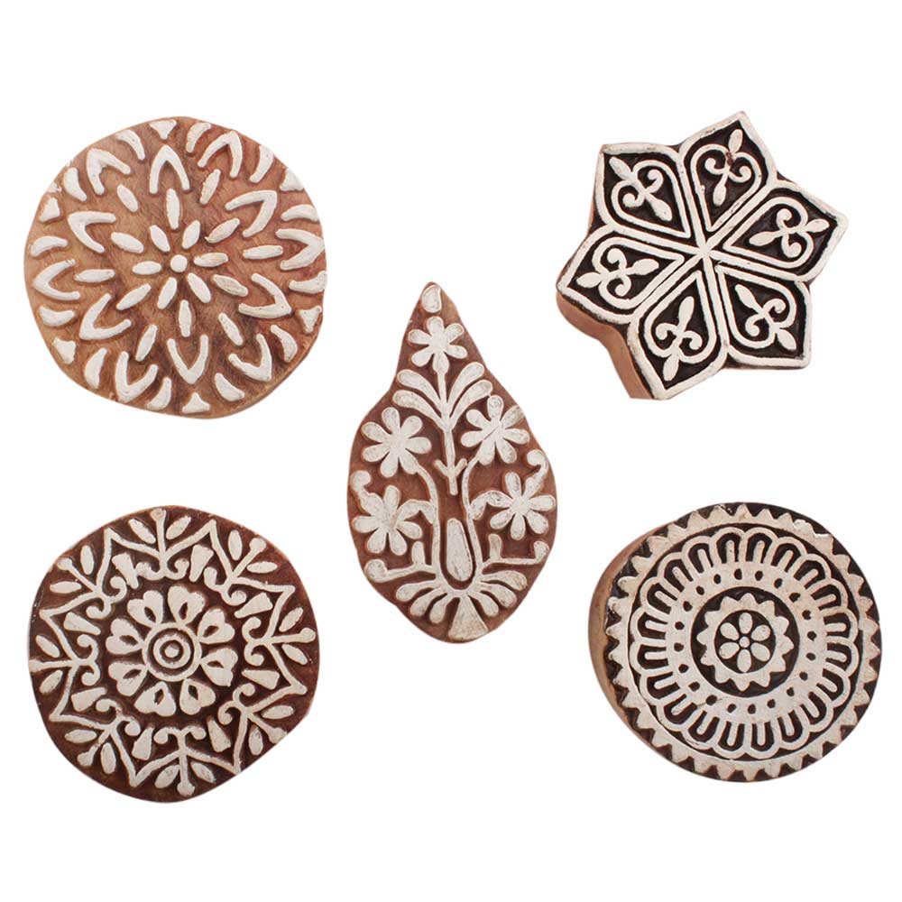 Set of 5 Piece New Mix Wooden Printing Blocks. Ideal for use on Fabric, Paper, Canvas, etc. These Blocks can be use to Print with Oil Colors, Fabric Colors, Water Colors, Acrylic Colors and Vegetable Colors.