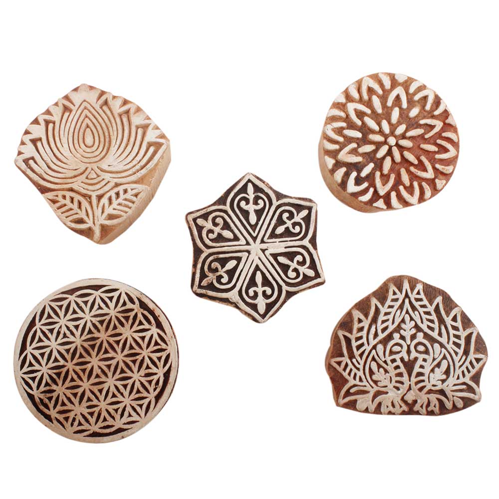 Set of 5 Piece New Mix Wooden Printing Blocks. Ideal for use on Fabric, Paper, Canvas, etc. These Blocks can be use to Print with Oil Colors, Fabric Colors, Water Colors, Acrylic Colors and Vegetable Colors.