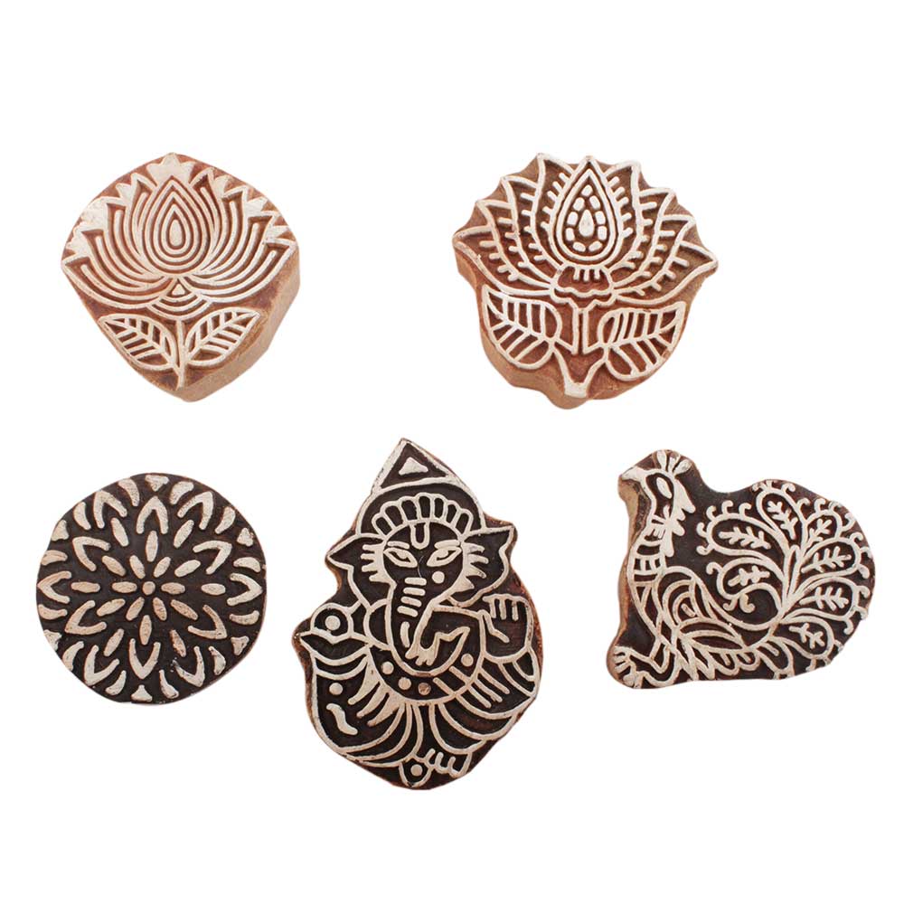 Set of 5 Piece New Mix Wooden Printing Blocks. Ideal for use on Fabric, Paper, Canvas, etc. These Blocks can be use to Print with Oil Colors, Fabric Colors, Water Colors, Acrylic Colors and Vegetable Colors.