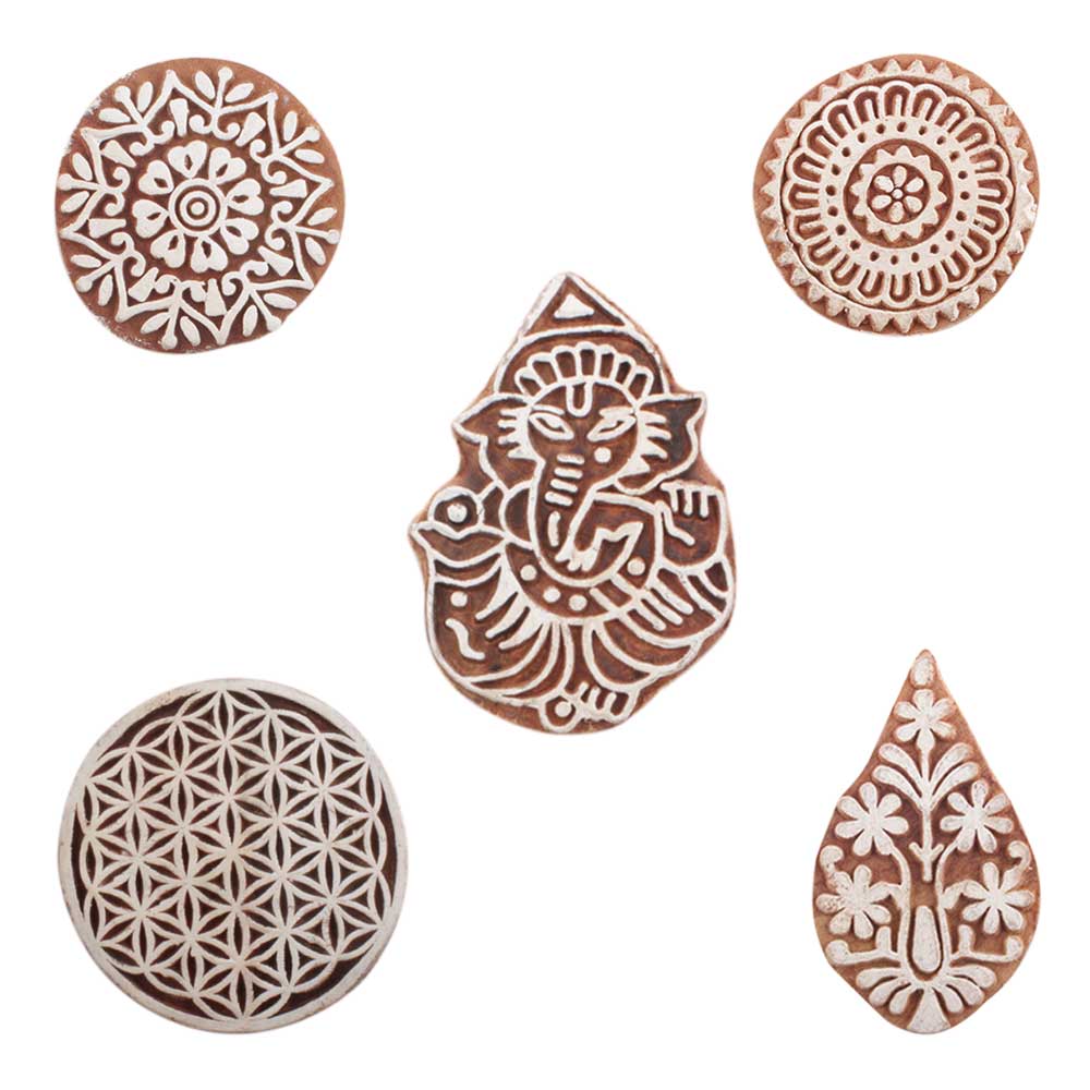 Set of 5 Piece New Mix Wooden Printing Blocks. Ideal for use on Fabric, Paper, Canvas, etc. These Blocks can be use to Print with Oil Colors, Fabric Colors, Water Colors, Acrylic Colors and Vegetable Colors.