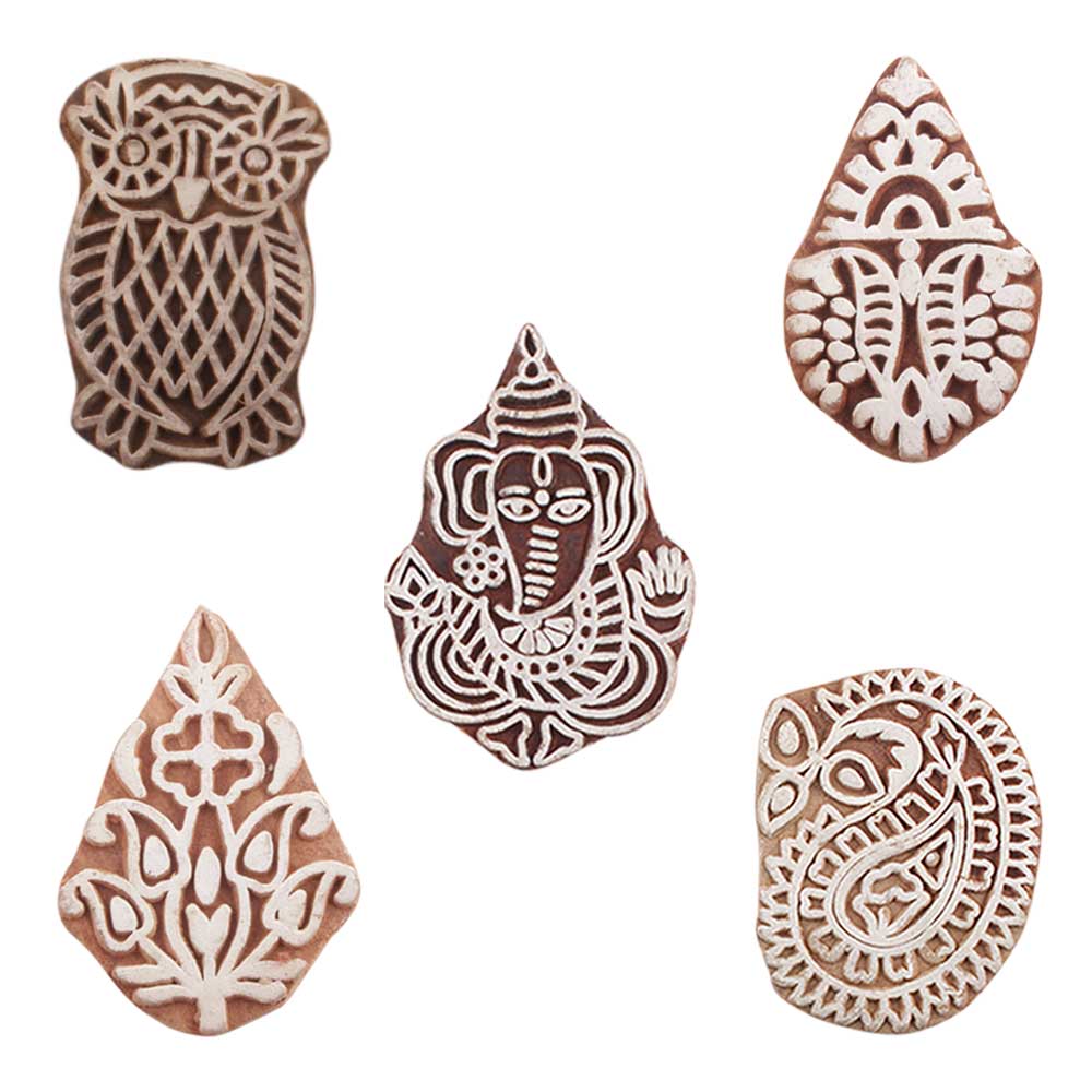 Set of 5 Piece New Mix Wooden Printing Blocks. Ideal for use on Fabric, Paper, Canvas, etc. These Blocks can be use to Print with Oil Colors, Fabric Colors, Water Colors, Acrylic Colors and Vegetable Colors.