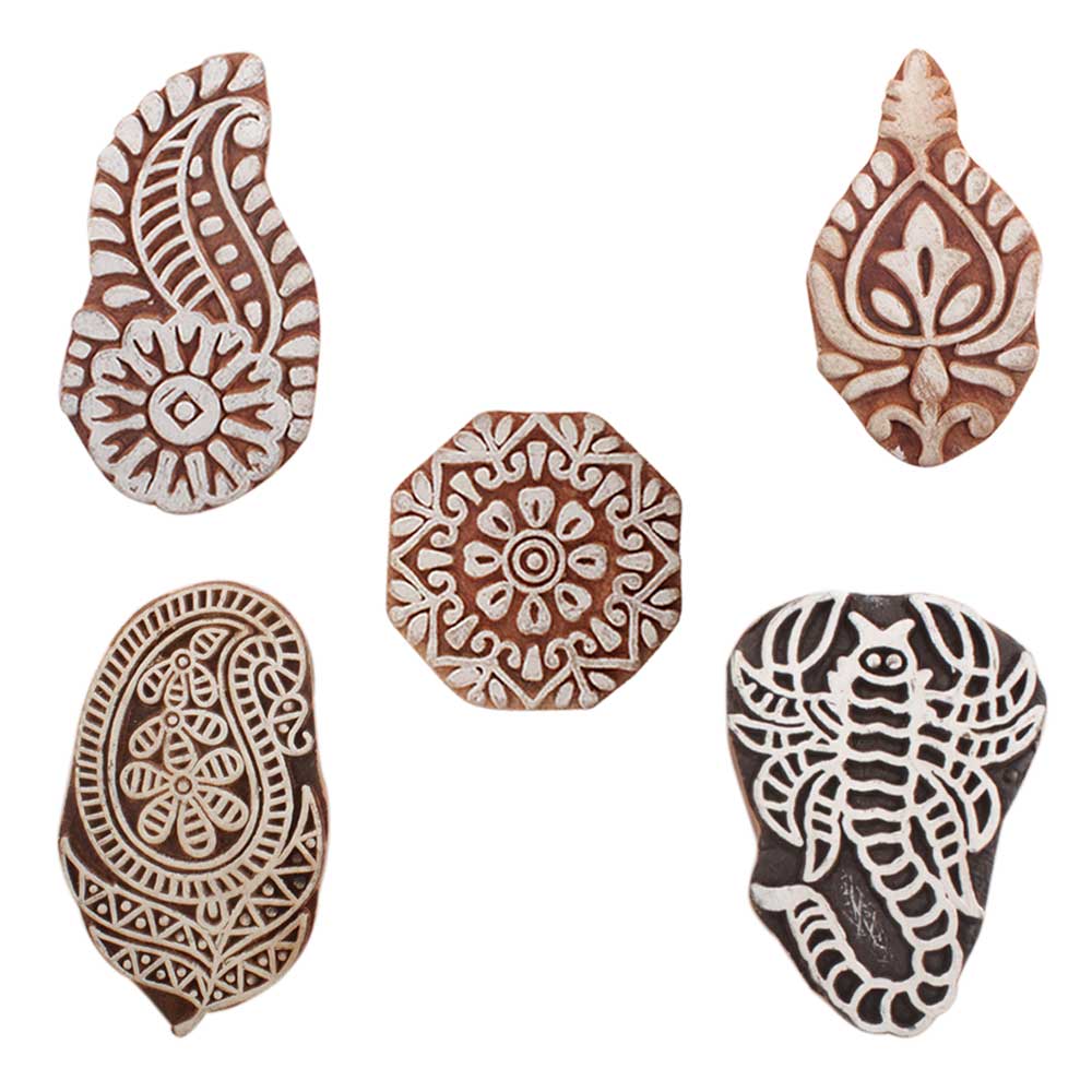 Set of 5 Piece New Mix Wooden Printing Blocks. Ideal for use on Fabric, Paper, Canvas, etc. These Blocks can be use to Print with Oil Colors, Fabric Colors, Water Colors, Acrylic Colors and Vegetable Colors.