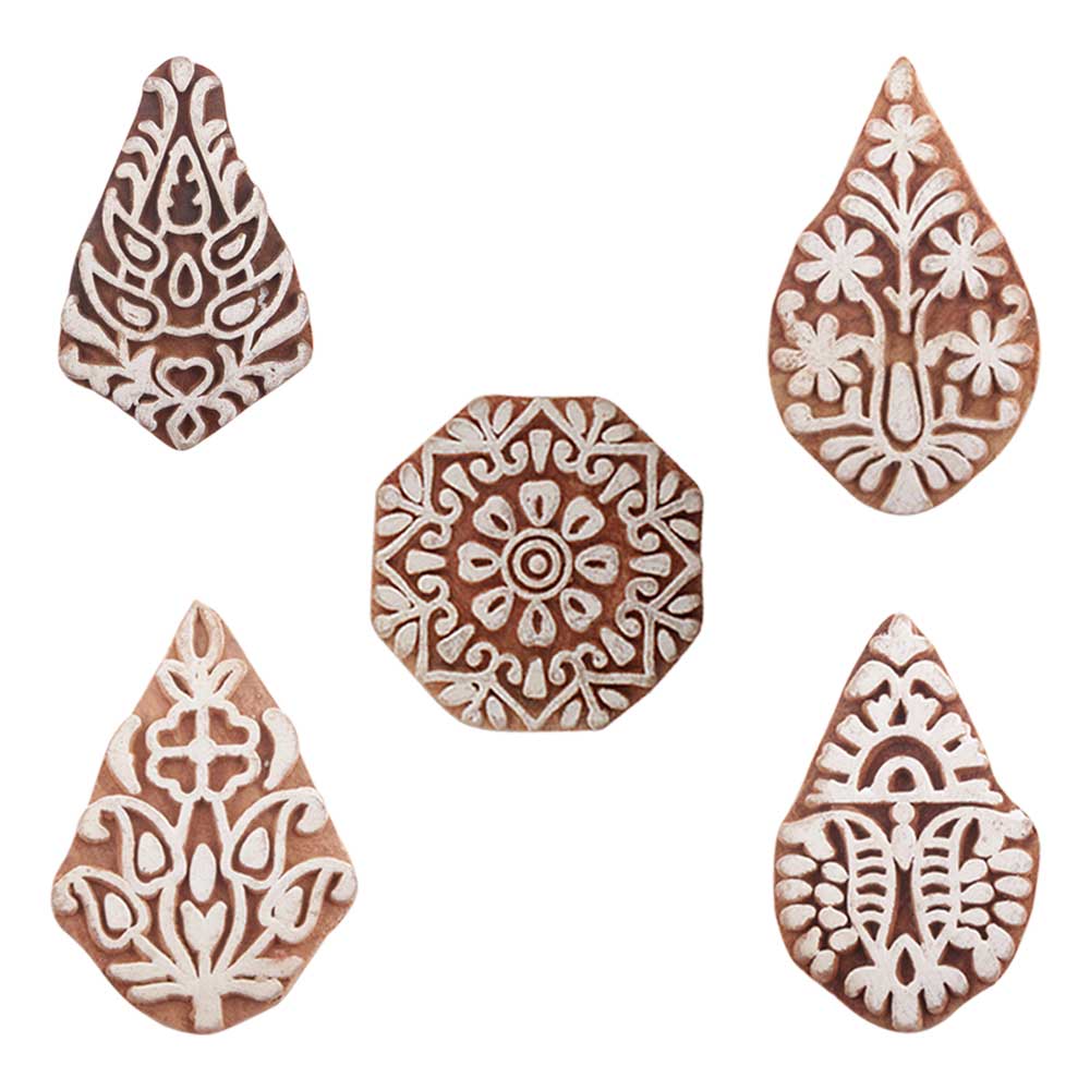 Set of 5 Piece New Mix Wooden Printing Blocks. Ideal for use on Fabric, Paper, Canvas, etc. These Blocks can be use to Print with Oil Colors, Fabric Colors, Water Colors, Acrylic Colors and Vegetable Colors.