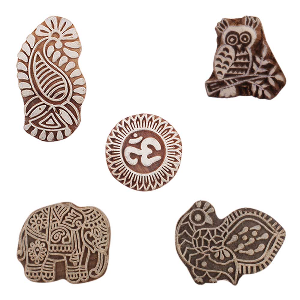 Set of 5 Piece New Mix Wooden Printing Blocks. Ideal for use on Fabric, Paper, Canvas, etc. These Blocks can be use to Print with Oil Colors, Fabric Colors, Water Colors, Acrylic Colors and Vegetable Colors.
