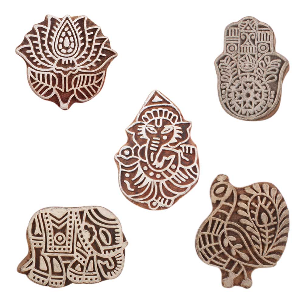 Set of 5 Piece New Mix Wooden Printing Blocks. Ideal for use on Fabric, Paper, Canvas, etc. These Blocks can be use to Print with Oil Colors, Fabric Colors, Water Colors, Acrylic Colors and Vegetable Colors.
