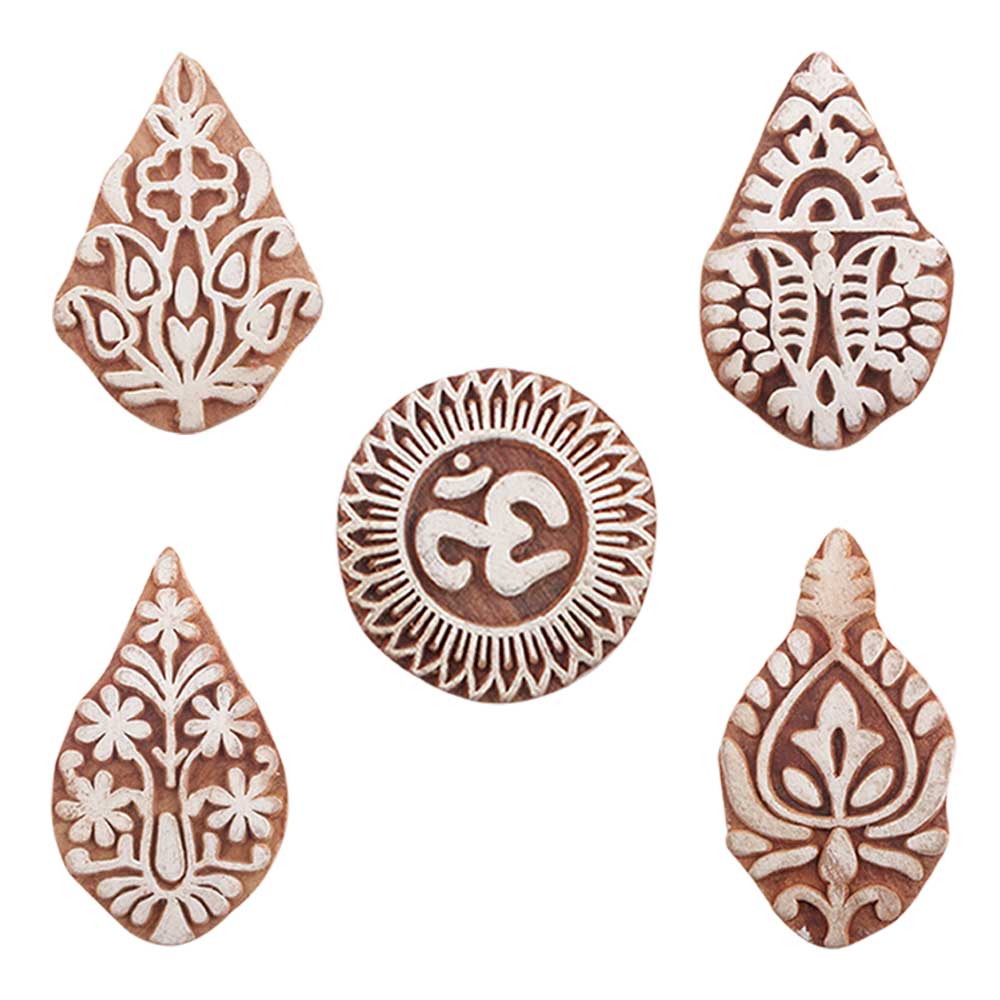 Set of 5 Piece New Mix Wooden Printing Blocks. Ideal for use on Fabric, Paper, Canvas, etc. These Blocks can be use to Print with Oil Colors, Fabric Colors, Water Colors, Acrylic Colors and Vegetable Colors.