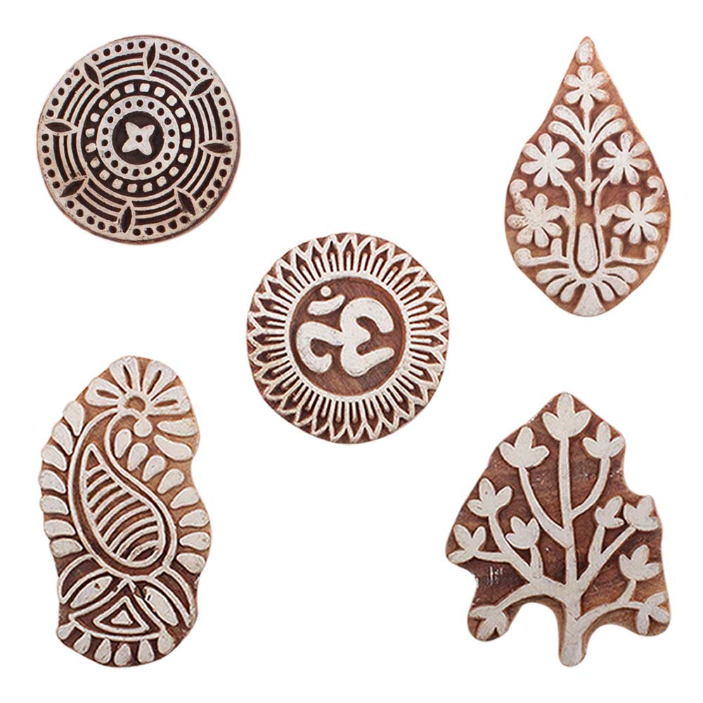 Set of 5 Piece New Mix Wooden Printing Blocks. Ideal for use on Fabric, Paper, Canvas, etc. These Blocks can be use to Print with Oil Colors, Fabric Colors, Water Colors, Acrylic Colors and Vegetable Colors.