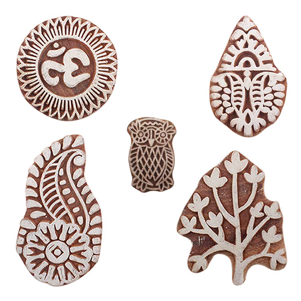 Set of 5 Piece New Mix Wooden Printing Blocks. Ideal for use on Fabric, Paper, Canvas, etc. These Blocks can be use to Print with Oil Colors, Fabric Colors, Water Colors, Acrylic Colors and Vegetable Colors.