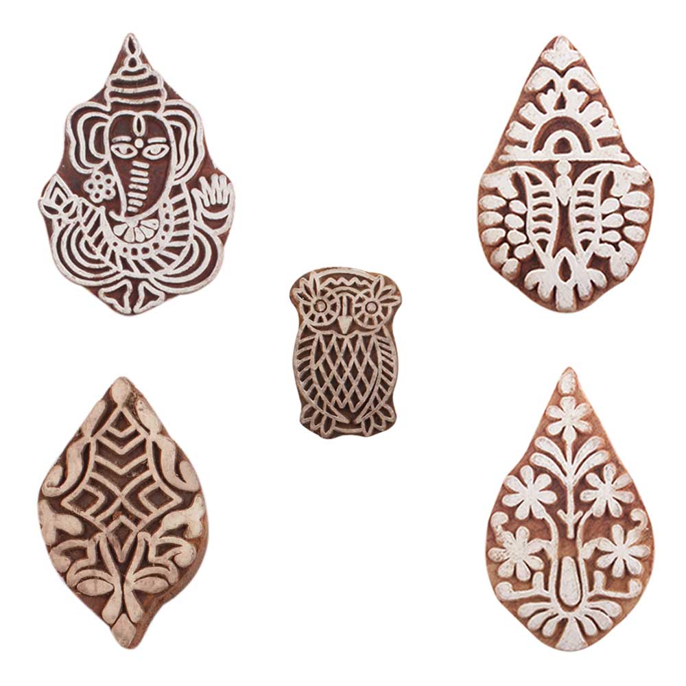 Set of 5 Piece New Mix Wooden Printing Blocks. Ideal for use on Fabric, Paper, Canvas, etc. These Blocks can be use to Print with Oil Colors, Fabric Colors, Water Colors, Acrylic Colors and Vegetable Colors.