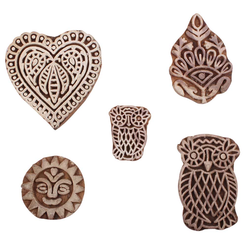 Set of 5 Piece New Mix Wooden Printing Blocks. Ideal for use on Fabric, Paper, Canvas, etc. These Blocks can be use to Print with Oil Colors, Fabric Colors, Water Colors, Acrylic Colors and Vegetable Colors.