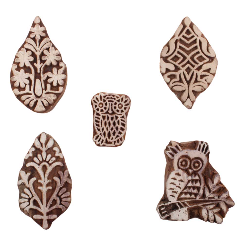 Set of 5 Piece New Mix Wooden Printing Blocks. Ideal for use on Fabric, Paper, Canvas, etc. These Blocks can be use to Print with Oil Colors, Fabric Colors, Water Colors, Acrylic Colors and Vegetable Colors.