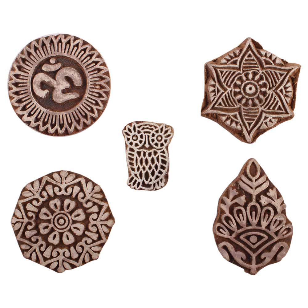 Set of 5 Piece New Mix Wooden Printing Blocks. Ideal for use on Fabric, Paper, Canvas, etc. These Blocks can be use to Print with Oil Colors, Fabric Colors, Water Colors, Acrylic Colors and Vegetable Colors.