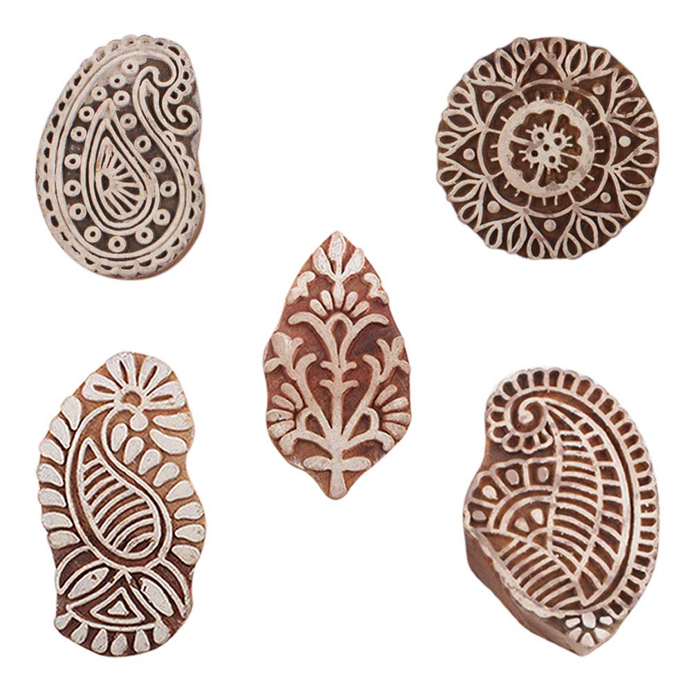 Set of 5 Piece New Mix Wooden Printing Blocks. Ideal for use on Fabric, Paper, Canvas, etc. These Blocks can be use to Print with Oil Colors, Fabric Colors, Water Colors, Acrylic Colors and Vegetable Colors.