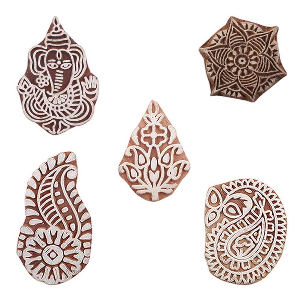 Set of 5 Piece New Mix Wooden Printing Blocks. Ideal for use on Fabric, Paper, Canvas, etc. These Blocks can be use to Print with Oil Colors, Fabric Colors, Water Colors, Acrylic Colors and Vegetable Colors.