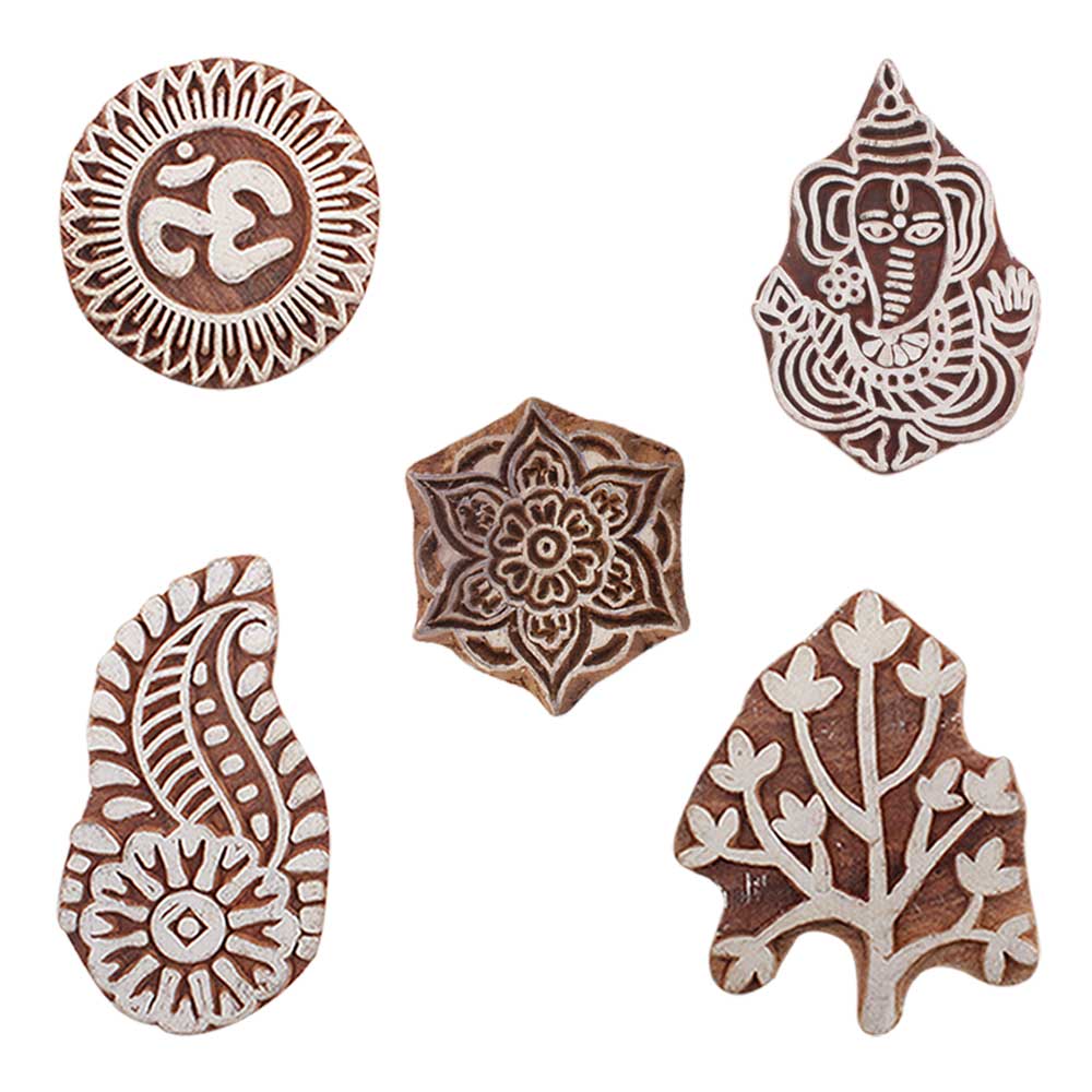 Set of 5 Piece New Mix Wooden Printing Blocks. Ideal for use on Fabric, Paper, Canvas, etc. These Blocks can be use to Print with Oil Colors, Fabric Colors, Water Colors, Acrylic Colors and Vegetable Colors.