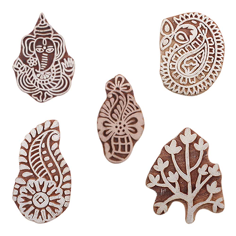 Set of 5 Piece New Mix Wooden Printing Blocks. Ideal for use on Fabric, Paper, Canvas, etc. These Blocks can be use to Print with Oil Colors, Fabric Colors, Water Colors, Acrylic Colors and Vegetable Colors.
