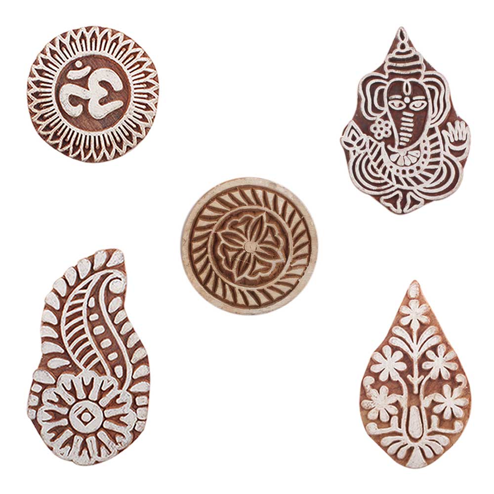 Set of 5 Piece New Mix Wooden Printing Blocks. Ideal for use on Fabric, Paper, Canvas, etc. These Blocks can be use to Print with Oil Colors, Fabric Colors, Water Colors, Acrylic Colors and Vegetable Colors.