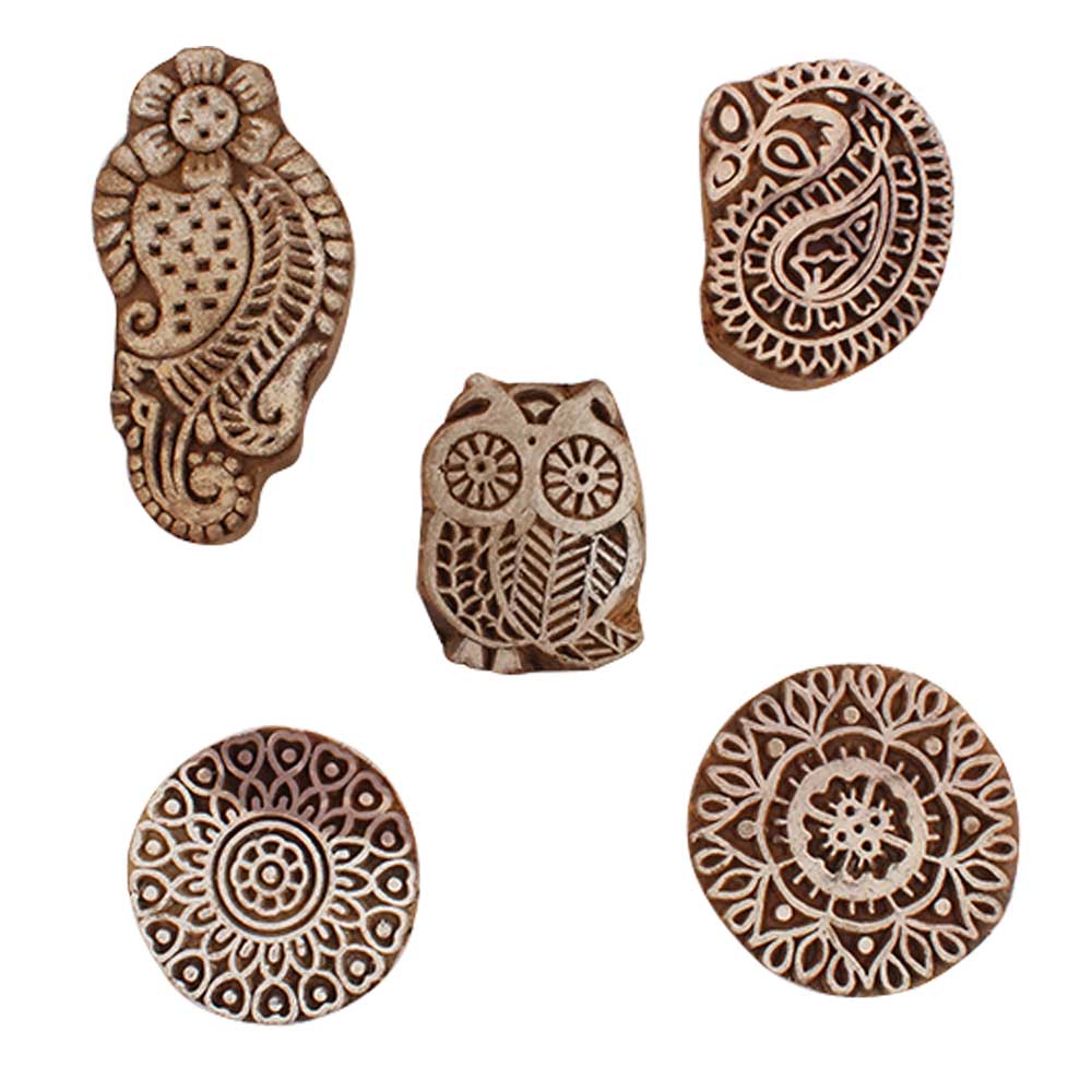 Set of 5 Piece New Mix Wooden Printing Blocks. Ideal for use on Fabric, Paper, Canvas, etc. These Blocks can be use to Print with Oil Colors, Fabric Colors, Water Colors, Acrylic Colors and Vegetable Colors.
