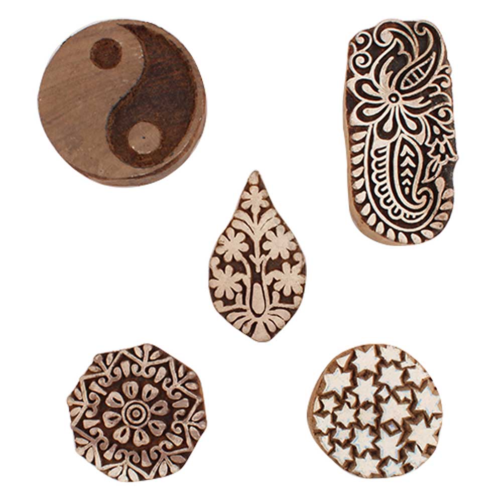 Set of 5 Piece New Mix Wooden Printing Blocks. Ideal for use on Fabric, Paper, Canvas, etc. These Blocks can be use to Print with Oil Colors, Fabric Colors, Water Colors, Acrylic Colors and Vegetable Colors.
