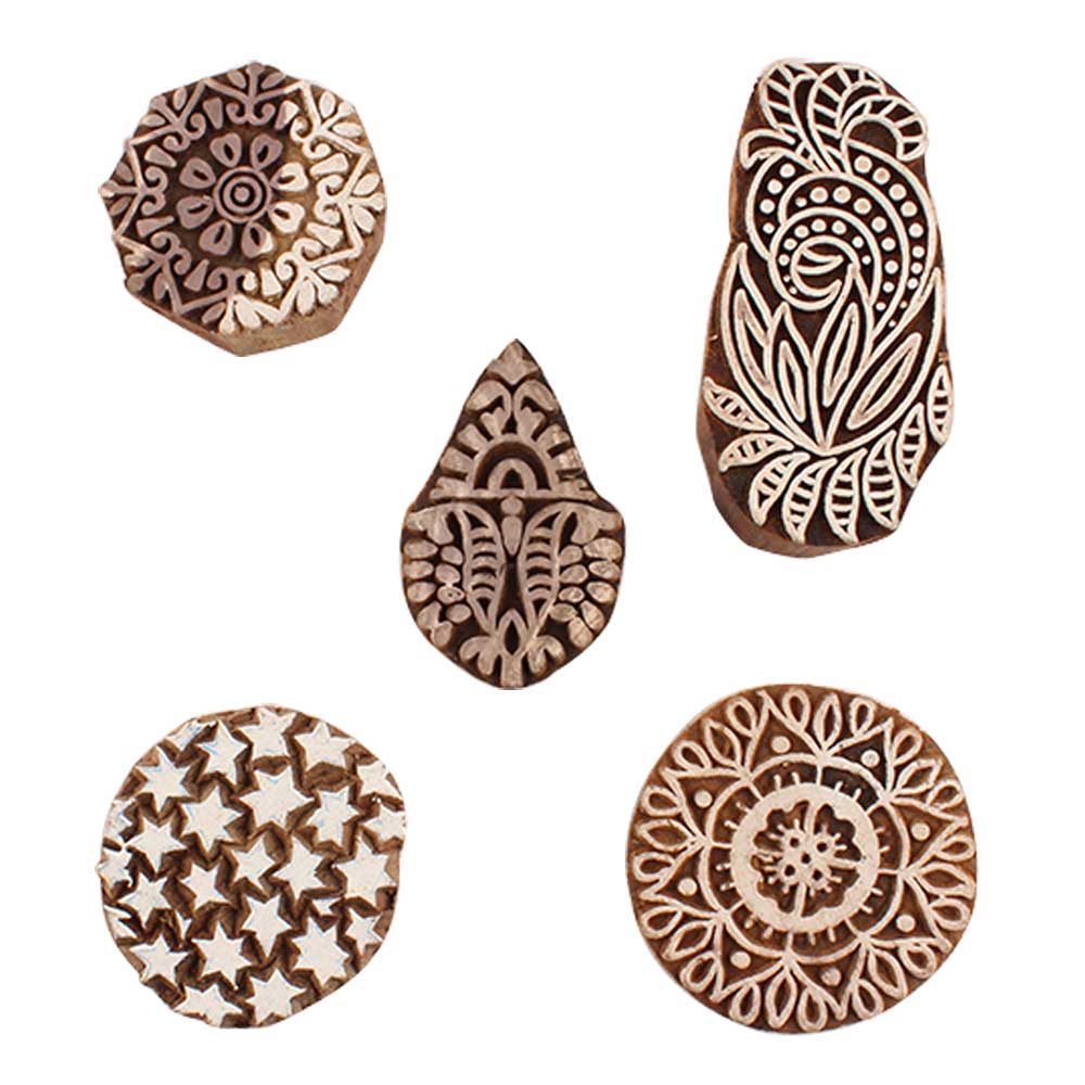 Set of 5 Piece New Mix Wooden Printing Blocks. Ideal for use on Fabric, Paper, Canvas, etc. These Blocks can be use to Print with Oil Colors, Fabric Colors, Water Colors, Acrylic Colors and Vegetable Colors.