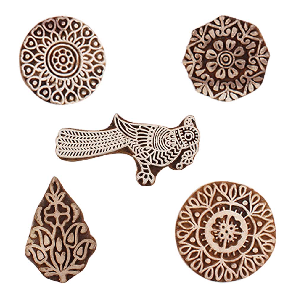 Set of 5 Piece New Mix Wooden Printing Blocks. Ideal for use on Fabric, Paper, Canvas, etc. These Blocks can be use to Print with Oil Colors, Fabric Colors, Water Colors, Acrylic Colors and Vegetable Colors.