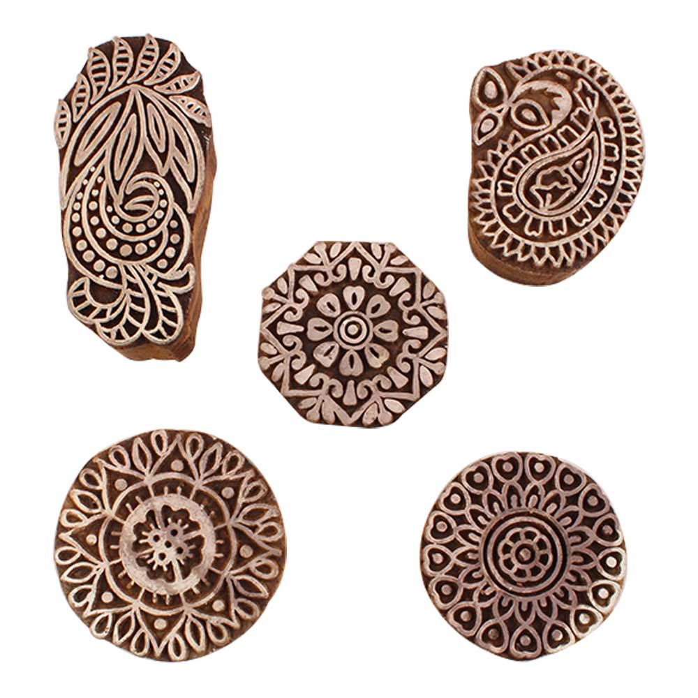 Set of 5 Piece New Mix Wooden Printing Blocks. Ideal for use on Fabric, Paper, Canvas, etc. These Blocks can be use to Print with Oil Colors, Fabric Colors, Water Colors, Acrylic Colors and Vegetable Colors.
