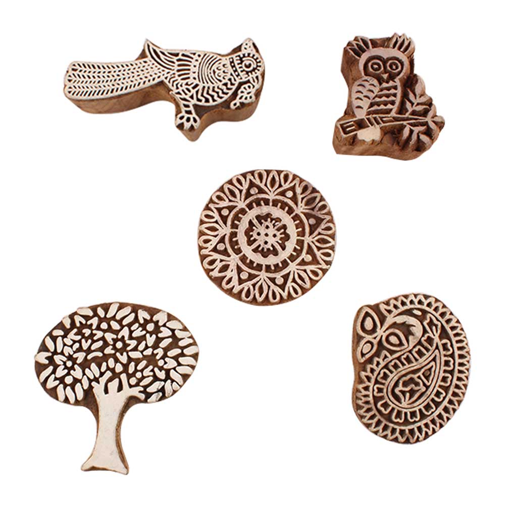 Set of 5 Piece New Mix Wooden Printing Blocks. Ideal for use on Fabric, Paper, Canvas, etc. These Blocks can be use to Print with Oil Colors, Fabric Colors, Water Colors, Acrylic Colors and Vegetable Colors.