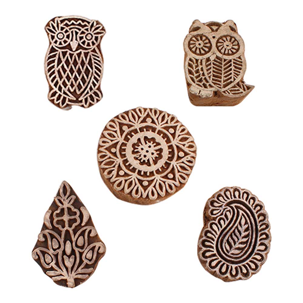 Set of 5 Piece New Mix Wooden Printing Blocks. Ideal for use on Fabric, Paper, Canvas, etc. These Blocks can be use to Print with Oil Colors, Fabric Colors, Water Colors, Acrylic Colors and Vegetable Colors.