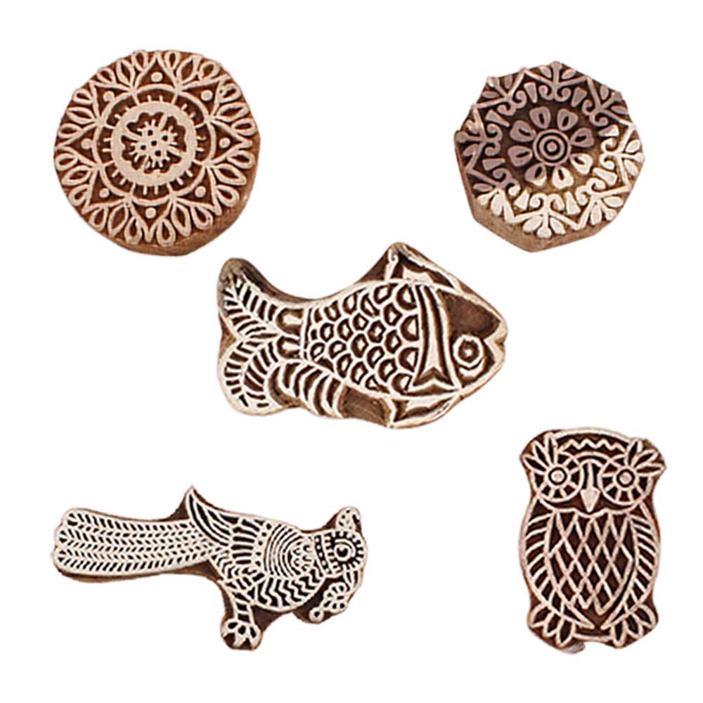 Set of 5 Piece New Mix Wooden Printing Blocks. Ideal for use on Fabric, Paper, Canvas, etc. These Blocks can be use to Print with Oil Colors, Fabric Colors, Water Colors, Acrylic Colors and Vegetable Colors.