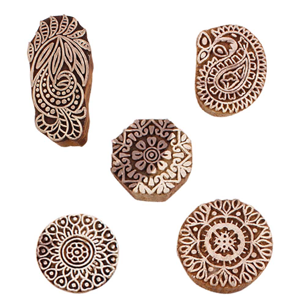 Set of 5 Piece New Mix Wooden Printing Blocks. Ideal for use on Fabric, Paper, Canvas, etc. These Blocks can be use to Print with Oil Colors, Fabric Colors, Water Colors, Acrylic Colors and Vegetable Colors.
