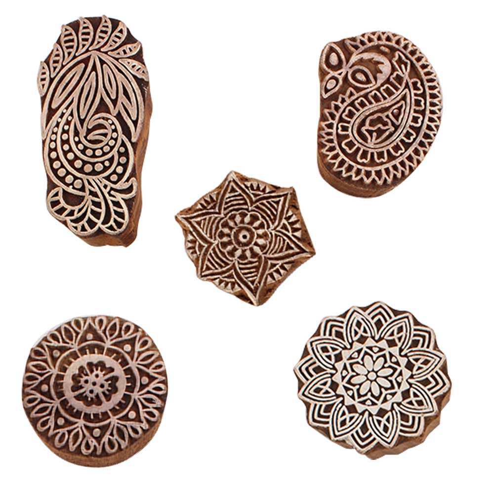 Set of 5 Piece New Mix Wooden Printing Blocks. Ideal for use on Fabric, Paper, Canvas, etc. These Blocks can be use to Print with Oil Colors, Fabric Colors, Water Colors, Acrylic Colors and Vegetable Colors.