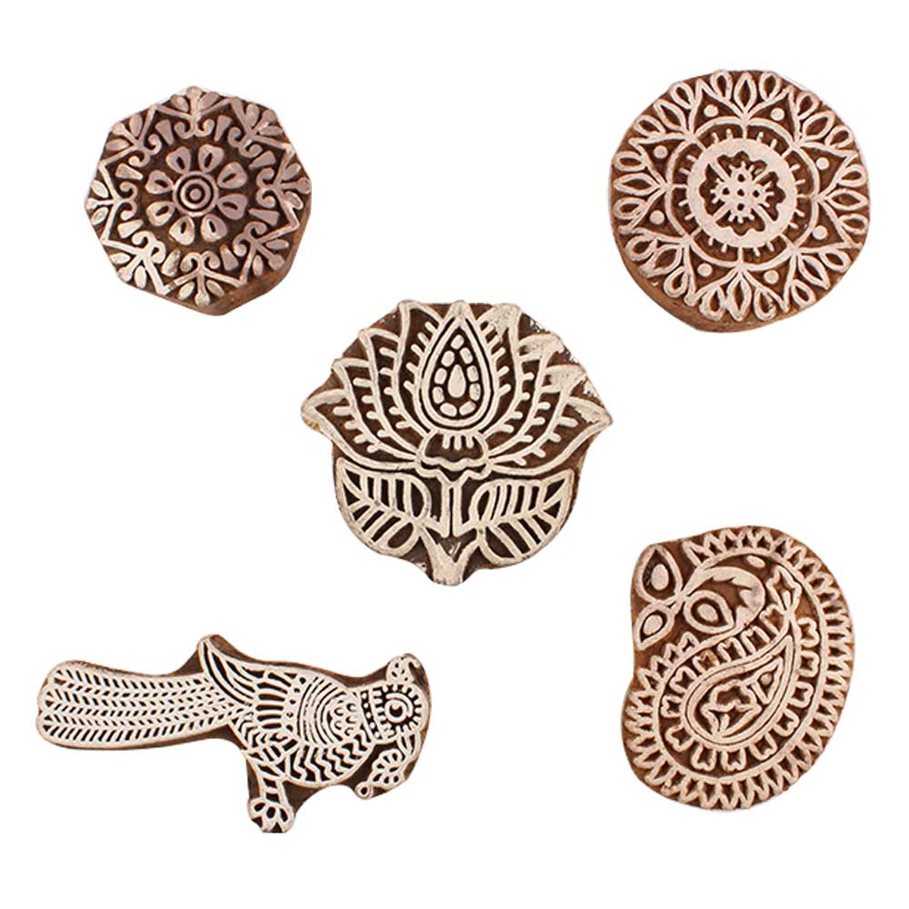 Set of 5 Piece New Mix Wooden Printing Blocks. Ideal for use on Fabric, Paper, Canvas, etc. These Blocks can be use to Print with Oil Colors, Fabric Colors, Water Colors, Acrylic Colors and Vegetable Colors.
